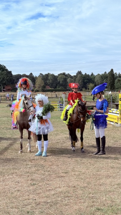 Am 31.08.2025 pünktlich um 8.00 Uhr ertönte die Stimme von Imke Frentzel am Mikrofon in der Reithalle und begrüßte alle Turnierteilnehmer bei strahlendem Sonnenschein und wünschte gutes Gelingen in jeder Prüfung. Den Auftakt in der Reithalle machte die Reiter – WB Schritt- Trab- Galopp Prüfung. Parallel warteten die Reiter und Reiterinnen schon auf dem Abreiteplatz vor dem Gelänge-Springplatz auf die Startfreigabe durch die Richter. Hier eröffnete um 8:30 Uhr der Geländereiter- WB 50cm, gefolgt vom Stilgeländereiter-WB ohne Bestzeit 60cm und vor der Mittagspause stand noch das Führzügel-WB mit Kostüm an. Die Teilnehmer flogen nahezu über die aufgebauten Hindernisse wie eine Holzbank, große Baumstämme, den Wall hoch und runter und auch der Wassergraben durfte nicht fehlen. Diesen Parcours galt es auch für die Führzügelklasse zu meistern, bei der die Kleinen von ihren Vertrauenspersonen am Boden mit dem Pony geführt wurden und die hohen Hindernisse durch niedrige wie Cavalettis ersetzt wurden.