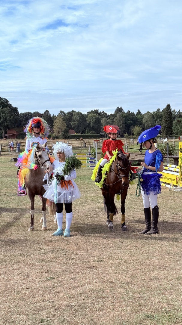 Beim Rallyritt am 17.05.2025 sammelten sich 18 Reiter und Reiterinnen im Reitstall Frentzel. Zu aller erst galt es die Ponys von der Weide zu holen, putzen, trensen und satteln. Zum Warmreiten der Ponys wurde die Reithalle genutzt. Die fünf Gruppen starteten nacheinander in den aufgebauten Parcours. An der ersten Station galt es die Spaghetti in die Makkaronieinzuführen und das Wort Mähnenkamm den Gruppenmitgliedern pantomimisch darzustellen. Auf dem Geländespringplatz waren Hüttchen im Slalom zu umreiten allerdings lag die Schwierigkeit darin, einen Löffel mit einer Kartoffel währenddessen zu transportieren. Danach ging es zum Hufeisen werfen.